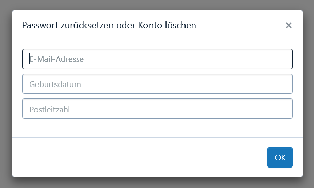 Rufen Sie die Webseite meine-arztdokumente.de in Ihrem Browser auf und klicken Sie auf „Passwort zurücksetzen oder Konto löschen“.